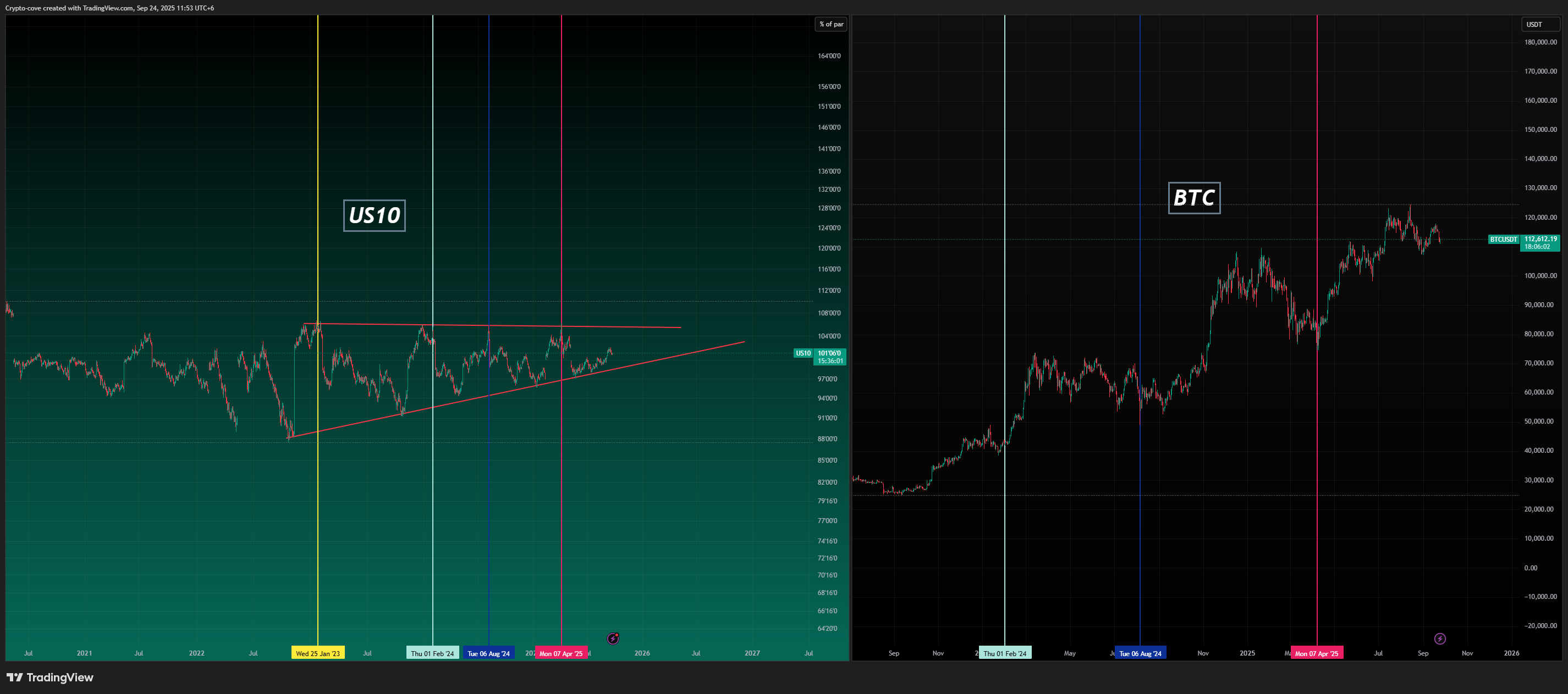 US10 bearish (yields falling): crypto usually pumps hard since lots of liquidity enters the market.